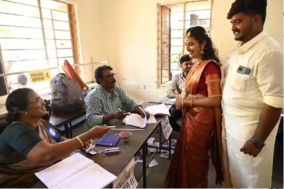 திருமண மண்டபத்திலிருந்து வீட்டிற்குச் செல்வதற்கு முன்னதாக, மணமக்கள் இருவரும் சென்னை அருகே உள்ள ஒரு வாக்குச்சாவடிக்குத் தங்களது குடும்பத்தினருடன் வருகை தந்தனர். மணமகன் பட்டு வேட்டி-சட்டையிலும், மணமகள் பட்டுச் சேலை மற்றும் ஆபரணங்கள் அணிந்தும் வரிசையில் நின்றது அங்கிருந்த மற்ற வாக்காளர்களை வியப்பில் ஆழ்த்தியது. “திருமணம் என்பது வாழ்க்கையில் முக்கியமான நிகழ்வு, ஆனால் நாட்டை ஆளும் தலைவரைத் தேர்ந்தெடுக்கும் இந்தத் தேர்தல் அதைவிட முக்கியமானது” என்று அந்தத் தம்பதி நெகிழ்ச்சியுடன் தெரிவித்தனர்.
