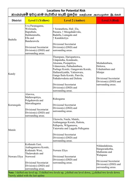 கண்டி மற்றும் நுவரெலியா மாவட்டங்களில் பல பகுதிகளுக்கு விடுக்கப்பட்ட மூன்றாம் நிலை அதாவது சிவப்பு மண்சரிவு எச்சரிக்கையினை தேசிய கட்டிட ஆராய்ச்சி நிறுவனம் (NBRO) மேலும் நீட்டித்துள்ளது. மக்களை வெளியேற அறிவுறுத்தும் சிவப்பு மண்சரிவு எச்சரிக்கை விடுக்கப்பட்டுள்ள மாவட்டங்கள் மற்றும் பிரதேச செயலகப் பிரிவுகள் பின்வருமாறு: