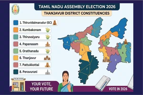 தஞ்சாவூர் தொகுதியில் தி.மு.க, அ.தி.மு.க, பா.ஜ.க மற்றும் நாம் தமிழர் கட்சி இடையே நான்கு முனைப் போட்டி நிலவுகிறது. குறிப்பாகப் பாபநாசம் தொகுதியில் தி.மு.க கூட்டணியின் ஐ.யூ.எம்.எல் (IUML) வேட்பாளர் ஏ.எம். ஷாஜஹான், அ.தி.மு.க-வின் டி. சண்முகபிரபு மற்றும் தவெக (TVK) சார்பில் போட்டியிடும் உ. அசாருதீன் ஆகியோரிடையே கடும் போட்டி நிலவுகிறது. திருவையாறு மற்றும் திருவிடைமருதூர் தொகுதிகளிலும் ஆளும் கட்சி மற்றும் எதிர்க்கட்சி வேட்பாளர்கள் தீவிரமாக வாக்குச் சேகரிப்பில் ஈடுபட்டிருந்த நிலையில், இன்று மக்கள் தங்களது தீர்ப்பை வழங்கி வருகின்றனர்.