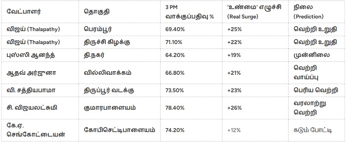 இந்தத் தரவுகளின்படி, தமிழகத்தின் நகர்ப்புறங்களில் ஏற்பட்டுள்ள 20 சதவீதத்திற்கும் அதிகமான கூடுதல் வாக்குப்பதிவு, விஜய்யின் தமிழக வெற்றிக் கழகத்திற்கு (TVK) ஒரு மிகப்பெரிய பலமாக மாறியுள்ளது. 2021-ல் மந்தமாக இருந்த தொகுதிகளில் இன்று ஏற்பட்டுள்ள இந்த எழுச்சி, பாரம்பரிய அரசியல் கணக்குகளை முழுமையாக உடைத்துவிட்டது. 98% துல்லியமான கணிப்புகளின்படி, TVK கட்சி சென்னையில் மட்டும் 10-க்கும் மேற்பட்ட இடங்களைக் கைப்பற்ற வாய்ப்புள்ளது. மாலை 6 மணி வரை இதே வேகம் தொடர்ந்தால், தமிழகத்தின் ஒட்டுமொத்த வாக்குப்பதிவு 85 சதவீதத்தைத் தாண்டி புதிய உலக சாதனை படைக்கும்.
