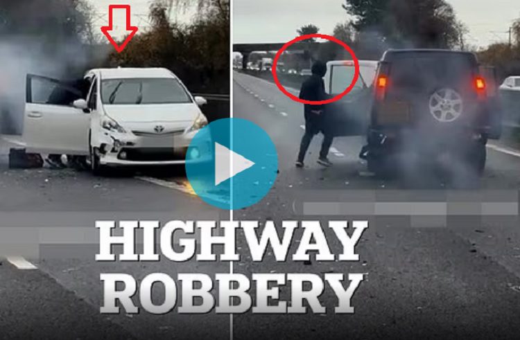 மோட்டார்வேயில் (Motorway) வாகன விபத்தில் சிக்கி நின்ற ஒரு டிரைவரை, முகமூடி அணிந்த ஒரு கும்பல் ஆயுதங்களைக் காட்டி மிரட்டிப் பொருட்களைக் கொள்ளையடிக்கும் பயங்கரமான காட்சி பதிவாகியுள்ளது. இந்த அதிர்ச்சிச் சம்பவம் தொடர்பாக நான்கு நபர்கள் கைது செய்யப்பட்டுள்ளனர்.